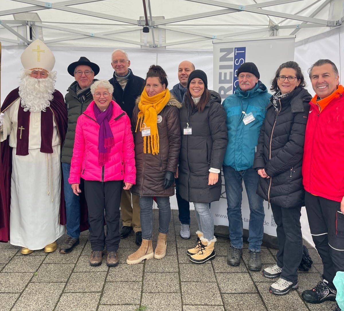 Der hl. Nikolaus und seine fleißigen Helfer vom Kulturverein Tarforst bei der diesjährigen Eröffnung des 9. Tarforster Weihnachtsmarktes. Auf dem Bild versammelt sind der gesamte Vorstand mit Oberbürgermeister Wolfram Leibe und Ortsvorsteher Werner Gorges.